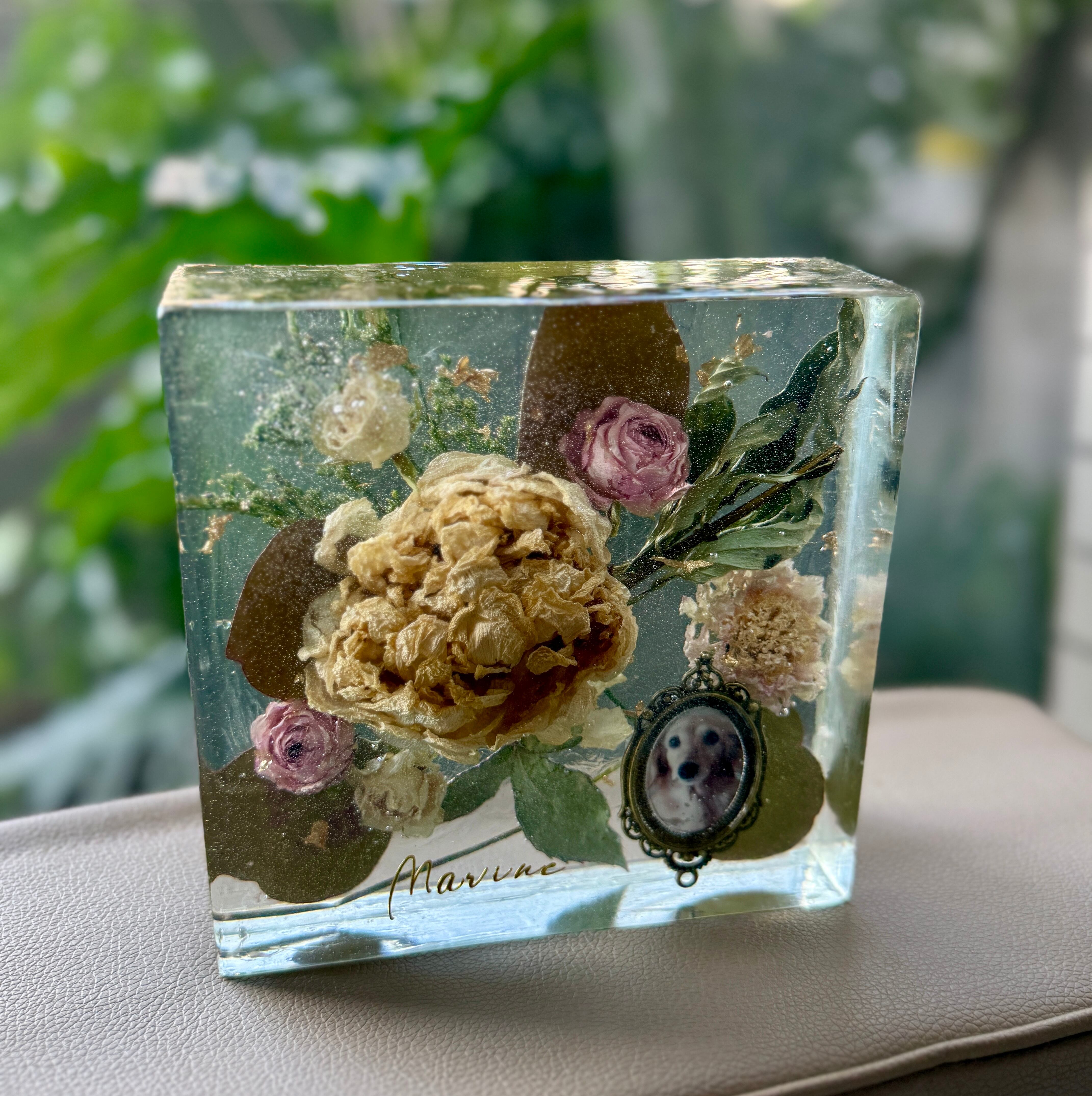 本作品は、お花とともに思い出の写真をアンティーク調のフレームに収め透明感あふれるエポキシレジンに。